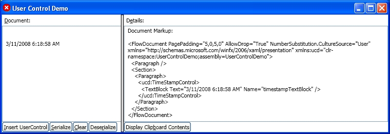Before pressing the Insert UserControl button, type some text in the RichTextBox on the left. Press Serialize and the document's contents are serialized to a string. Then press Clear and Deserialize, and you see the document's text restored. So far, so good. Now press Insert UserControl, Serialize, and Deserialize. When you press Deserialize, a XamlParseException is thrown, with this message: