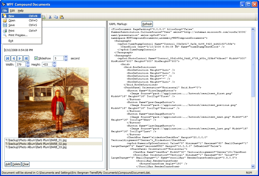 When the document is printed, the print code calls IEnhancedUserControl.GetPrintMarkup() and renders the XAML returned by that method. This lets a UserControl have a totally different appearance when printed. For example, when the PhotoControl is printed, none of the buttons or checkboxes are displayed. Only the selected image appears on the printed page. The print files, DocumentPaginatorWrapper.cs and Print.cs, are based on code posted in Feng Yuan's blog (see the source code for the URL).