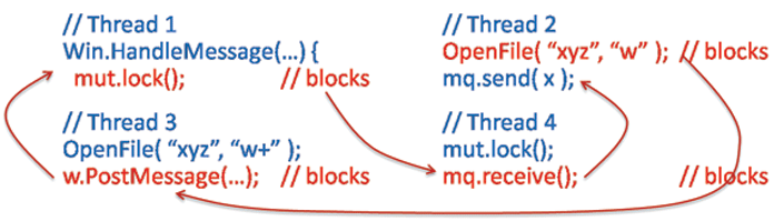 // Global data Mutex mut; WaitableObject w_mut; MessageQueue queue; WaitableObject w_queue; // Thread 1 StartWait( w_mut ); mut.lock(); // A EndWait( w_mut ); StartWait( w_queue ); queue.receive(); // B: blocks EndWait( w_queue ); mut.unlock(); // Thread 2 StartWait( w_mut ); mut.lock(); // C: blocks EndWait( w_mut ); queue.send( msg );