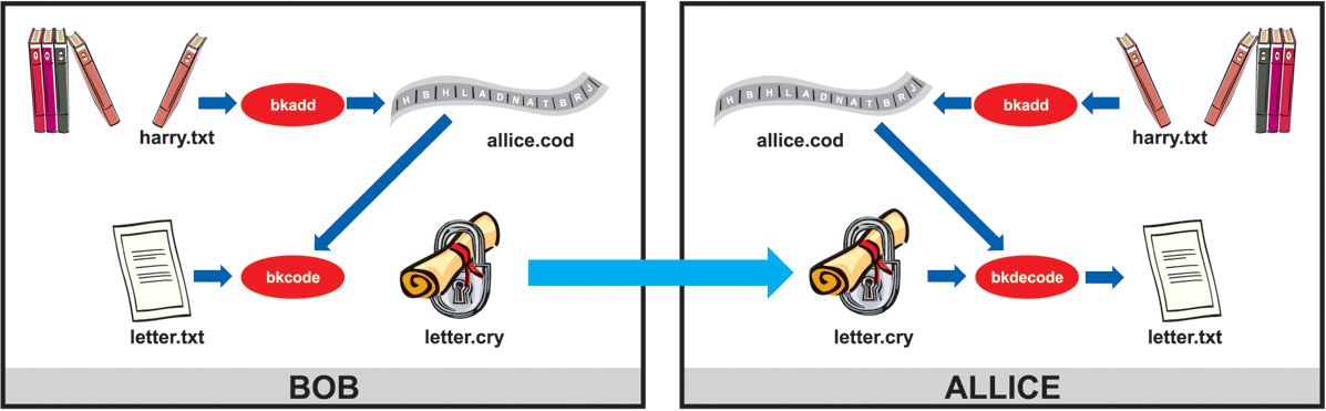 The idea is to create a "tank" of letters from books for each of the correspondents. Using the command bkadd allice mybook.txt 1, Bob creates the file allice.cod with the initial letters of each word in mybook.txt. The last parameter determines which letter of each word should be usedpositive values 1, 2, 3, stand for the first, second, third, respectively, and setc letter, while negative values mean that letters should be counted from the last position in the word. If this parameter is omitted, the first letters are taken as the default.