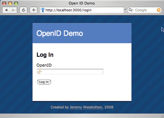 Go to http://localhost:3000/login in your web browser and you should see a simple login form. If you have an OpenID, you should be able to log in!