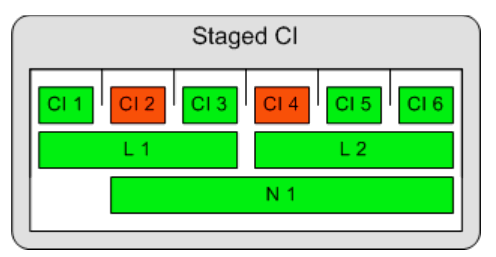 Staged CI is a practice where a tight loop is used for the typical CI build and one or more additional loops are used to automate a more thorough determination of the code quality. The reason for the multiple loops is that you want to keep the CI loop tight to provide feedback to developers as quickly as possible. In the tight loop, you're willing to sacrifice accuracy of the quality determination for speed. But once you have the quick feedback, you can take a little more time to get more detailed feedback from the additional loops. The end result is that for each project, you have multiple build loops in your system, one loop for each stage. Each stage is progressively more thorough and thus includes longer sets of tests.