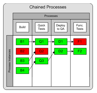 The Chained Processes approach does present the challenge of traceability. As each process stands alone, the linkage between successive process executions is based on parameters being passed in. If we want to determine the build and code responsible for a failed Quick Tests execution, we need to get the build number that was passed into our process execution as a parameter. Process-oriented systems built around this approach typically do not provide any built-in traceability mechanism for navigating the process chains. Likewise, process-based systems typically do not provide any built-in way of passing artifacts from one process to another in a traceable manner.