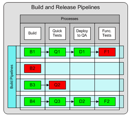 While the Build and Release Pipelines approach is similar to the Chained Processes approach in that both rely on non-overlapping processes, the difference comes down to the central concept. The Build and Release Pipelines approach uses the pipeline as the primary concept, while it is the process that is the central concept in the Chained Process approach. In the Build and Release Pipelines approach, the processes are executed within the context of a pipeline.