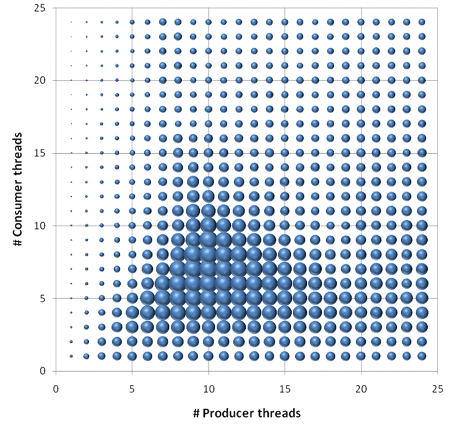 Figures 1 and 2 show two useful visualization tools that will help us understand our code's parallel performance. Figure 1 shows a sample scatter graph that charts throughput results for a selected algorithm against different numbers of two kinds of workers: producer threads and consumer threads. The larger the bubble, the greater the throughput. We can get a sense of how this particular algorithm scales, and in what directions, by examining how and where throughput grows and shrinks. In this example, we have good scalability up to a total of about 15 threads before we start to peak and realize no further gains, and we can see that scalability is better when there are somewhat more producers than consumers in the system.