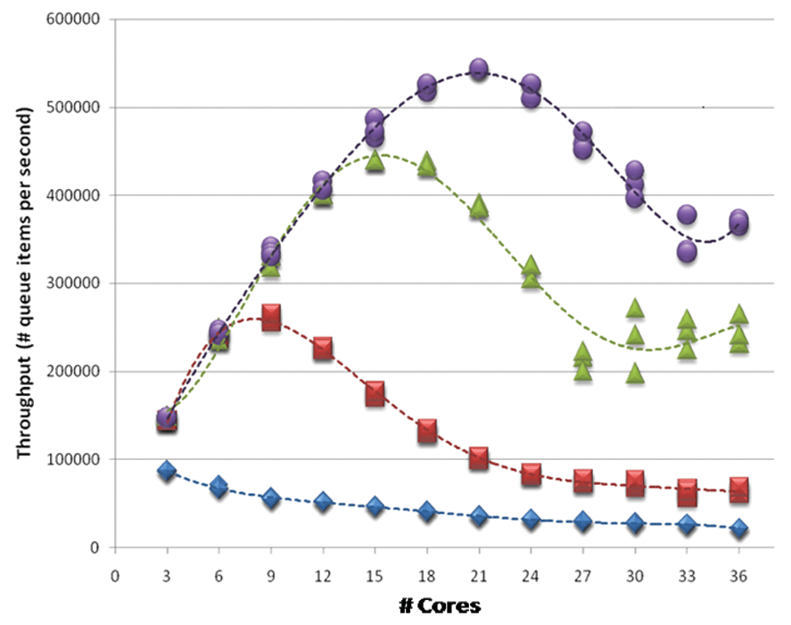 The other basic penalty is oversubscription, or having more CPU-bound work ready to execute than we have available hardware. These samples were taken from test runs on a 24-core machine; sure enough, in Figure 1 we see a faint diagonal line where #producers + #consumers = 24, above which throughput is noticeably thinner; sometimes the result is even more dramatic. Similarly, in Figure 2 we see even the best algorithms can't scale beyond the available cores, and incur a penalty for trying to exceed that number by adding contention at least for CPU time and often also for other resources.
