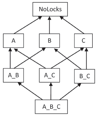 It's clear from Figure 1 that a type describing wider lock options can be implicitly converted to any type describing narrower lock options. In other words, it is okay for a function that has the option to take a larger set of locks to call a function that has the option to take a subset of those locks, but not the other way around.