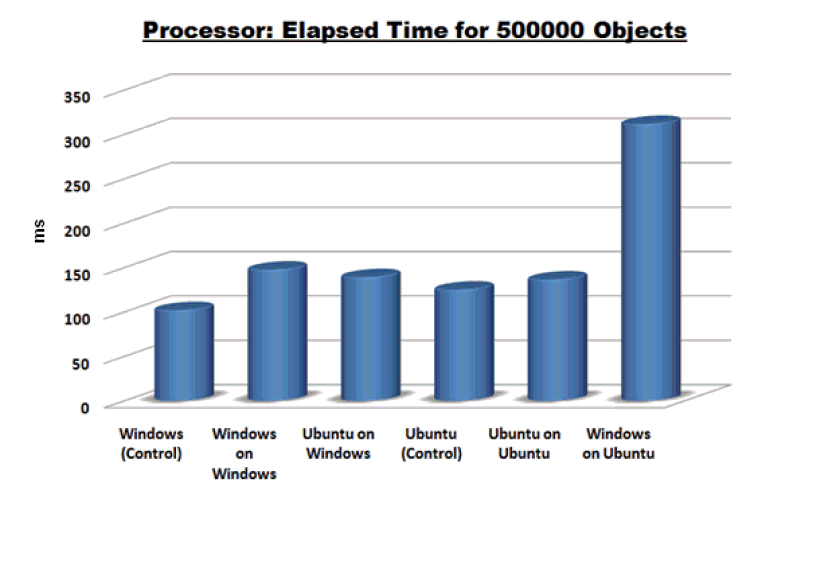 The results show a minor decrease in performance compared to the controls when the host operating system is the same as the guest operating system. The most surprising result is the difference between running Ubuntu-on-Windows and running Windows-on-Ubuntu. Windows-on-Ubuntu took more than twice the time in creating the objects compared to the control, while Ubuntu-on-Windows was actually faster than Windows-on-Windows. Overall, the results show that there are no major differences between the guest and the host, Windows-on-Ubuntu notwithstanding. I suspect that the large differences here are a result of the way the abstraction layer executes the Windows code when Ubuntu is the host.