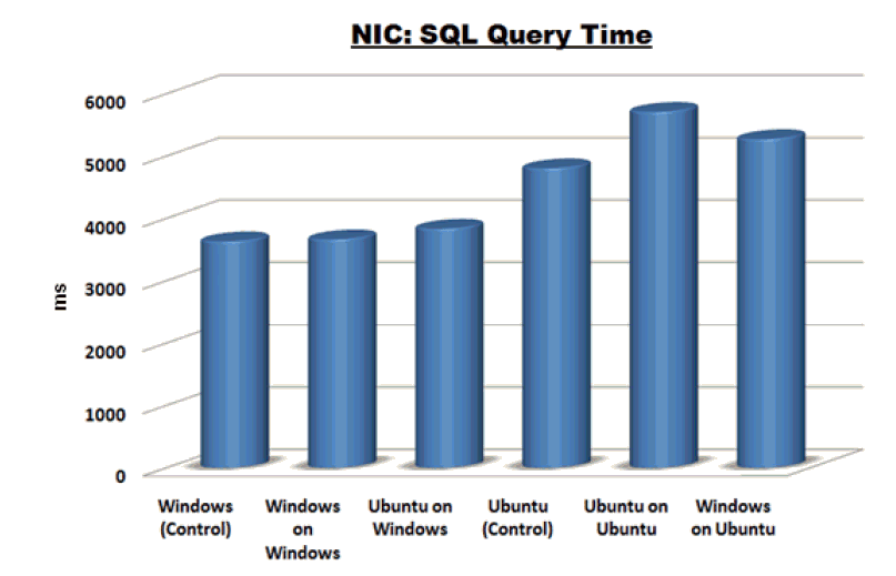 The SQL query result set included 99,900 rows. The results here show a distinct speed difference when using Ubuntu as the host system, compared to Windows as the host. I suspect that the reason is that drivers for devices such as NICs are specifically written by manufacturers for Windows, while drivers in Linux distributions (such as Ubuntu) are written by the open-source community, which may lead to slight differences in implementations. There is almost no speed difference between the Windows control and the guests on Windows. On the Ubuntu side, there is a little more variation, with the surprise that Ubuntu on Ubuntu is the slowest (although not exceedingly far behind the control). Again, I attribute this to the drivers for Ubuntu being written by the open-source community instead of NIC manufacturer.
