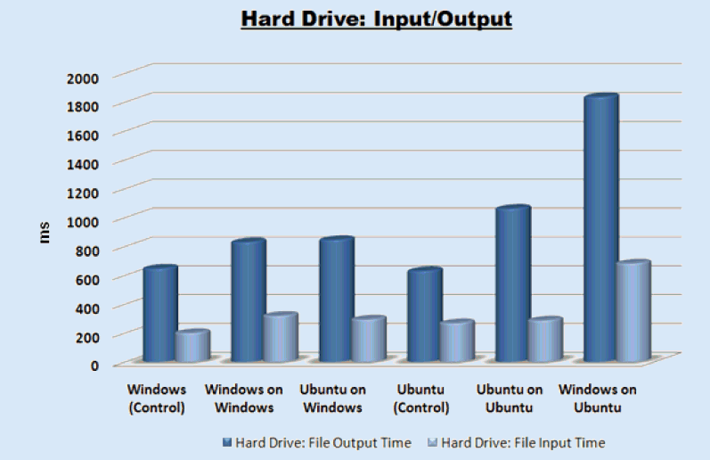 These results show little variation when Windows is the host, but much more variation when Ubuntu is the host. With Windows and Ubuntu as the controls, their results are similar, as are the two guest configurations on Windows. The main surprise in this test is that Windows-on-Ubuntu was almost twice as slow on both the input and the output side of things.