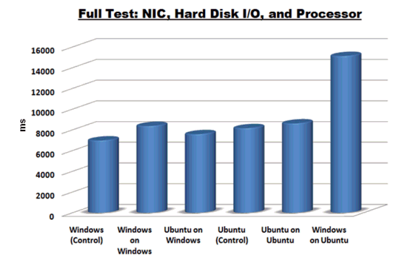 The tests show similar results across the board, with the exception of Windows-on-Ubuntu, which underperformed the others consistently. The tests show fairly conclusively that, except for the Windows-on-Ubuntu case, a VM is just as usable as a physical PC for software development. While there's a slight degradation in performance in many cases, the decrease is minor overall and likely worth the efficiency gains from having any operating system readily available.