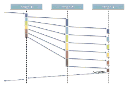 A third classic example of independent work that should run asynchronously is pipelining, and the independent pieces of work are the pipeline stages. In a nutshell, here's the idea: We have a series of pieces of data to be processed in order (e.g., series of packets to prepare for sending). Each piece has to go through several stages of processing (e.g., decorate, compress, encrypt) that need to be applied to a given piece of data in order.