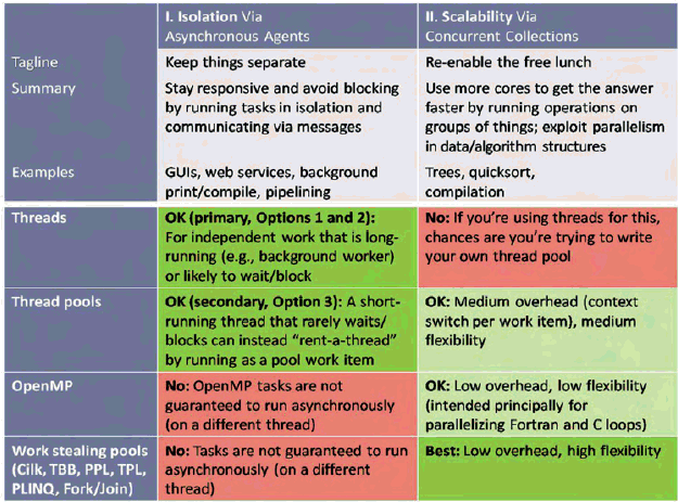 Table 1 summarizes these two pillars, and also summarizes how well each is served by four major tools at our disposal today for expressing concurrency: threads, thread pools, work stealing runtimes, and data-parallel facilities like OpenMP.