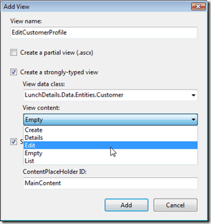 Again, Views display the data given to them by Controllers. If you have a strongly-typed object (such as Customer above) that you will be passing to a View, Visual Studio can automatically generate the View for you and even add the controls that map to the respective object properties that will be bound as well as validation controls (although you'll have to write the code to actually do the validation). When creating Views using the IDE you can use the following Add View window: