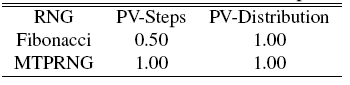 The second tuftest conducted was the bday() test. This test is an extension of the iterated spacings test. Marsaglia defines the birthday test bday() to treat each 32-bit number from the RNG as a birthday. The test generates 232 RNG samples (birthdays), sorts them, and then computes the differences between values. The result provides a purported Poisson value with a mean of 4. This process is repeated to get a sample of 5000 from the Poisson distribution. Then a goodness-of-fit test is applied to this sample and the result is inserted into a chi-square distribution function to get a p-value [7]. In our case the bday() test showed mixed results, the duplicates expected and observed, varied based on the number of samples. For more duplicates the values were closer together compared to the fewer ones. The detailed results can be obtained from our original study (see 1CS-706: Random Number Generation via Threading). The original study, due to complications and time constraints, conducts tests on a set of values from MTPRNG using less than 100,000 samples.