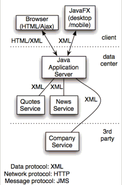 To illustrate, the following sample application -- a company's research portal for investment bankers -- combines HTML, an XML Web service, Ajax/JavaScript, Java, and JavaFX. (Source code that implements this application is available at informationweek.com/1231/ddj/code.htm.) The application consists of three Web services: