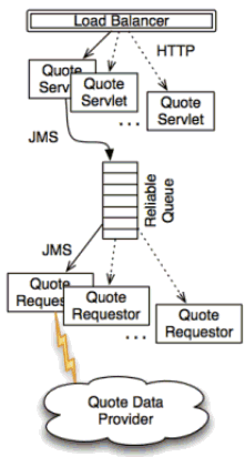Multiple Java Servlets are deployed to serve requests for quote data over HTTP. This data is retrieved from an internal cache, if available and up to date. Otherwise a request to a third-party provider is enqueued on a reliable JMS queue. Separately, one of the redundant Quote Requestor components will dequeue the request, retrieve the data from the provider, and then return it to the client in the form of XML. This distributed architecture provides scalability to the quotes service (multiple Quote Servlets share the load), and reliability (the queue has guaranteed delivery, and multiple queue readers ensure uptime).