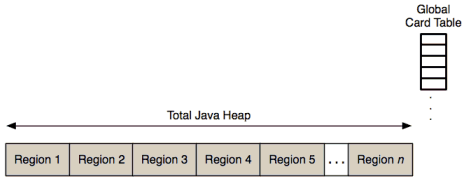 Regions are further broken down into 512 byte sections called cards (see Figure 2). Each card has a corresponding one-byte entry in a global card table, which is used to track which cards are modified by mutator threads. Subsets of these cards are tracked, and referred to as Remembered Sets (RS), which is discussed shortly.