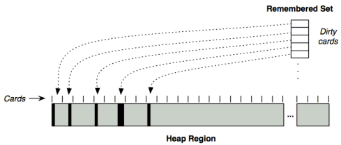 In reality, each region's remembered set is implemented as a group of collections, with the dirty cards distributed amongst them according to the number of references contained within. Three levels of courseness are maintained: sparse, fine, and course. It's broken up this way so that parallel GC threads can operate on one RS without contention, and can target the regions that will yield the most garbage. However, it's best to think of the RS as one logical set of dirty cards, as the diagrams show.