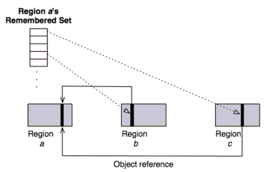 Each region maintains an associated subset of cards that have recently been written to, called the Remembered Set (RS). Cards are placed in a region's RS via a write barrier, which is an efficient block of code that all mutator threads must execute when modifying an object reference. To be precise, for a particular region (i.e., region a), only cards that contain pointers from other regions to an object in region a are recorded in region a's RS (see Figure 3). A region's internal references, as well as null references, are ignored.