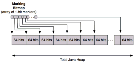 Concurrent marking identifies live data objects per region, and maintains the pointer to the next free byte, called top. There are, however, small stop-the-world pauses (described further below) that occur to ensure the correct heap state. A marking bitmap is maintained to create a summary view of the live objects within the heap. Each bit in the bitmap corresponds to one word within the heap (an area large enough to contain an object pointer; see Figure 4). A bit in the bitmap is set when the object it represents is determined to be a live object. In reality there are two bitmaps: one for the current collection, and a second for the previously completed collection. This is one way that changes to the heap are tracked over time.