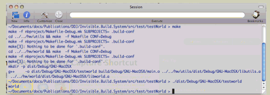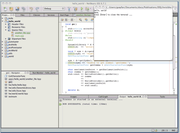 The next stage was to actually build the system using the ibs-generated build files. For starters Bob fired up NetBeans on Mac OS X, built and ran the hello_world application. This caused all its dependencies to be built and finally the application ran in its little terminal window and indeed printed the vaunted "hello, world!" message (see Figure 2).
