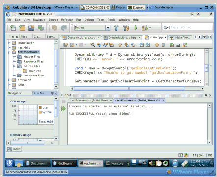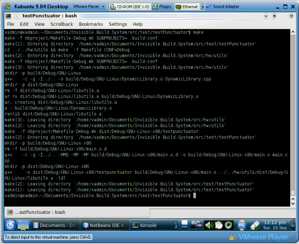 Isaac commended Bob on a job well done, but Bob wasn't done. He knew that Isaac was an old Unix hand and he proceeded to demonstrate the ibs-generated build files on Kubuntu 9.04 (in a VM). First he built the libPunctuator project in the NetBeans IDe and then the testPunctuator project (see Figure 4).