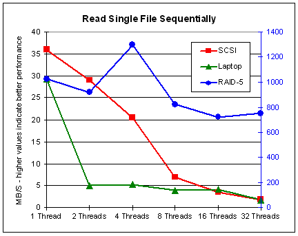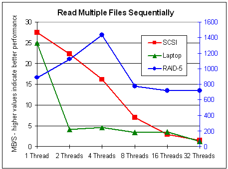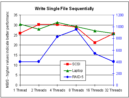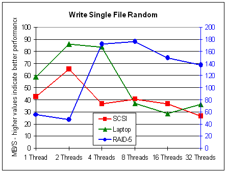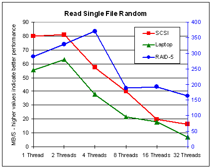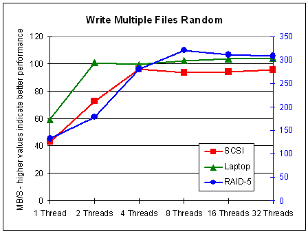 The results for multiple files are similar to those for sequential read: Performance generally decreases with multiple threads on single disks, but it increases for a RAID system -- in cases of sequentially writing, up to 8 threads. In cases of writing a single file, the results are surprising: It seems that up to 8 threads do not affect performance on single disks and do increase performance on a RAID system. More than 8 threads always decreases performance.