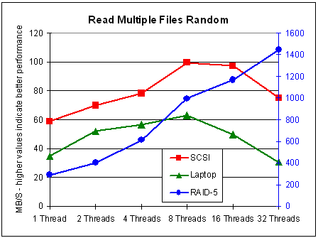 I repeated the entire test suite three times. The values I present here are the average of the three runs. The standard deviation in most cases did not exceed 10-20%. All tests have been also run three times with reboots after every run, so that no file was accessed from cache. These runs were slower, of course, but the influence of the number threads was similar to the results shown here (with the exception of random read multiple files; see below). To suppress caching effects with the test, I used different set of files for each subtest with 1, 2...,32 threads.
