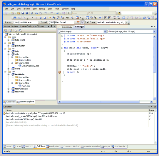Figure 1 shows the Visual Studio IDE with the various Hello World projects organized in folders (apps, dlls, hw, and test).