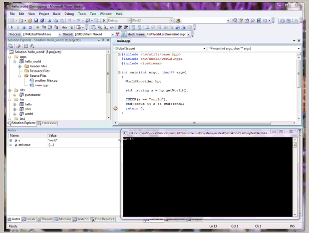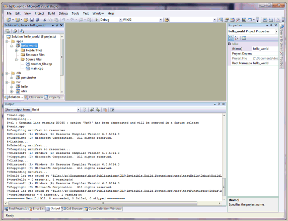 As you recall, Isaac the development manager became a true Invisible Build System (ibs) convert after seeing ibs in action. He gave Bob the mandate to use ibs on Windows to build the company's top-secret project: "Hello World - Enterprise Platinum Edition". The Windows developers of the company sweat by Visual Studio. Visual C++ supports a makefile-like build environment via the NMAKE tool, but it is not very common. Visual Studio provides both an IDE-based build environment for C/C++ projects as well as several alternatives for automated builds from the command line (vcbuild.exe, Visual Studio automation and extensibility object model, direct invocation of devenv.exe). The build files shared by all these approaches (except NMAKE) are the project and the solution. There is one project file per logical project and it encapsulates all the information about a project (same as the Makefile + nbproject directory of NetBeans). The solution is a collection projects and it corresponds the project group of NetBeans.