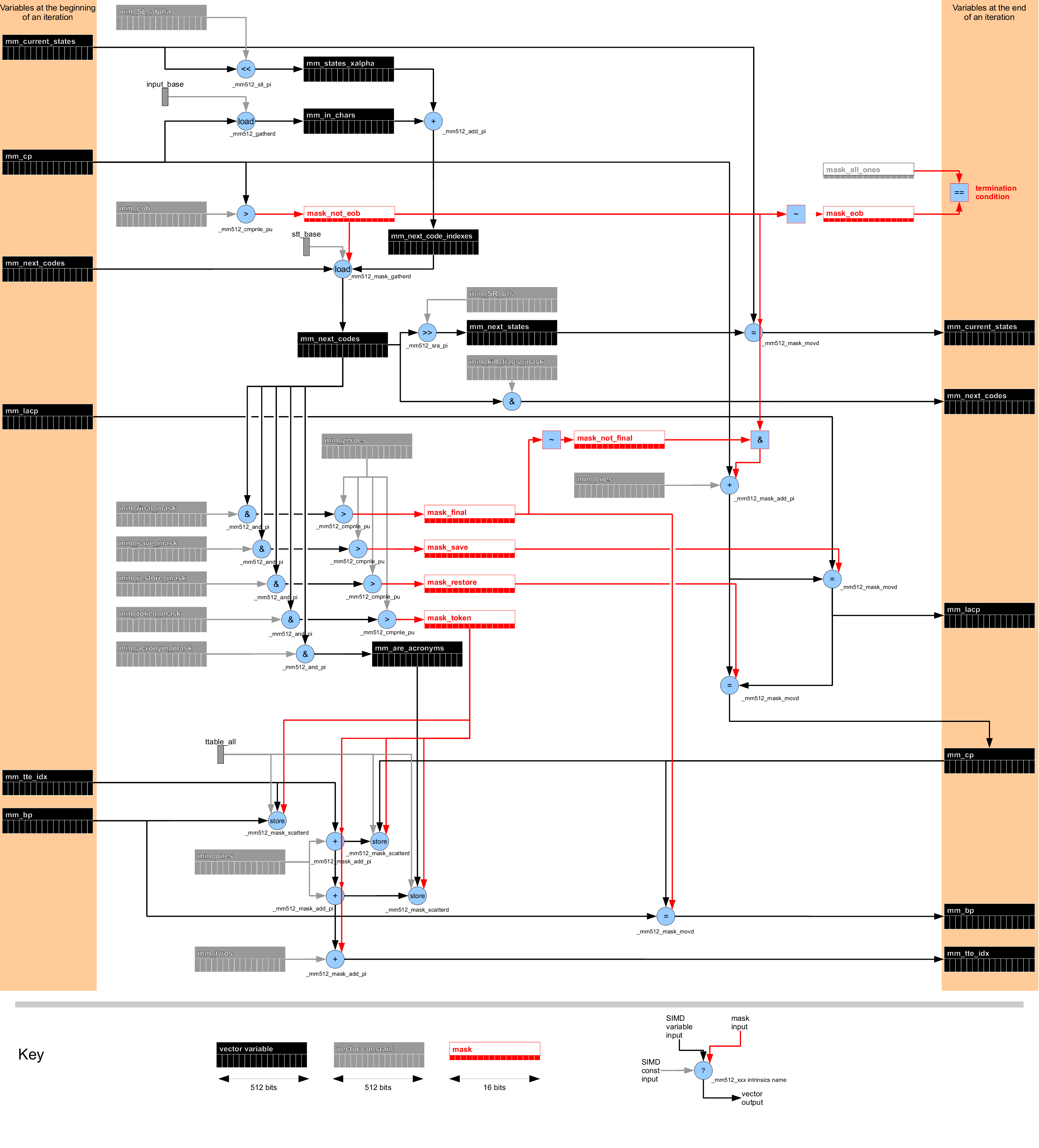 Except for the if statement that detects the global termination condition, the code is branchless and it corresponds to the data flow of Figure 1. The figure represents precisely one iteration of the loop in Listing 4, where 16 conjoined FSMs read the respective inputs, load the next state codes from the state transition table, decode them (possibly generating outputs) and jump to the next states. A black box represents a vector variable, a grey box represents a constant, a red box represents a mask, and a blue circle represents a vector operation.
