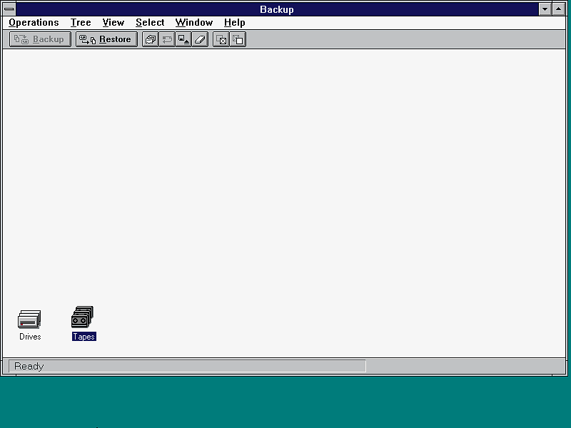 Figure 1: The Windows NT Backup program inititally displays icons labeled Drives and Tapes. Selecting Drives allows you to define directories and individual files for backup. Selecting Tapes permits you to restore previously backed-up data.