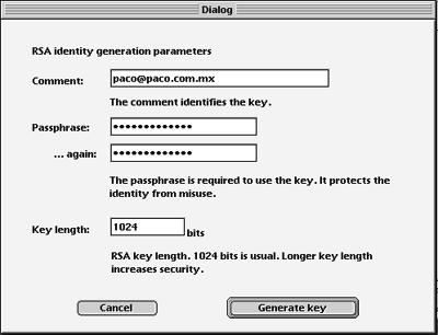 Figure 1: RSA key-pair generation process in F-Secure client for Macintosh. The default bit size is 1024, but can be changed. A passphrase to unlock the private key, and a comment line must be provided before key generation takes place.