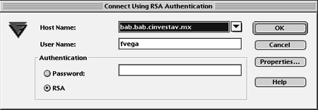 Figure 3: Login window of F-Secure. The server and the authentication method (RSA or UNIX password) are selected prior to login.