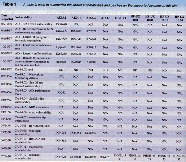 Table 1: A table is used to summarize the known vulnerabilities and patches for the supported systems at this site