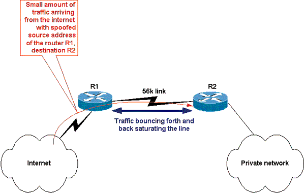 Figure 4: DoS attack using echo ports as a source and destination between two routers on a slow WAN link (initial packets use spoofed IP address of one of the routers)