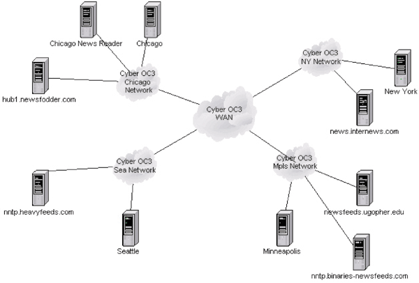 Figure 4: The Cyber OC3 Network. Four different POPs each contain at least one news server. Each server exchanges articles with all other internal servers and with several outside servers (reachable by various outside network connections)
