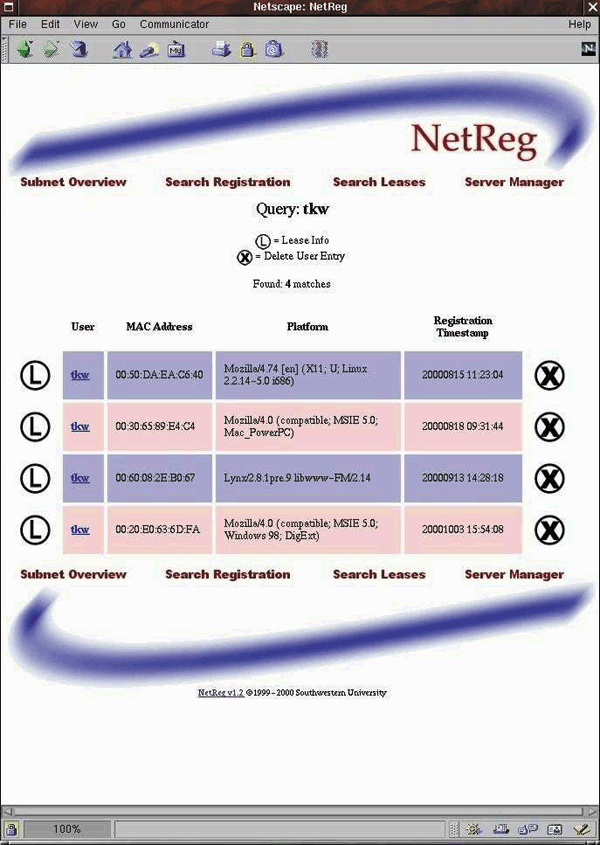 Figure 5: The search results of a query for all registrations by a single user with the user ID tkw