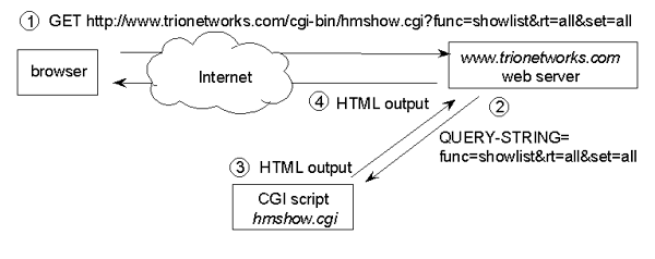 Web server invokes CGI script hmshow.cgi to generate dynamic content