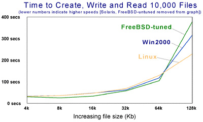 Time to create, write, and read 10,000 files (Solaris and FreeBSD-untuned removed)