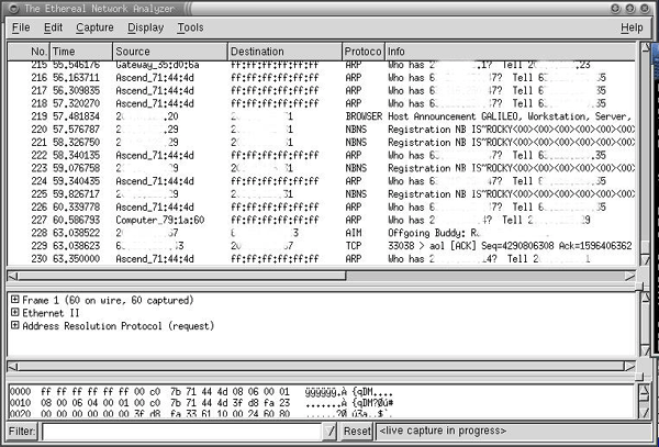 The main Ethereal window during a capture