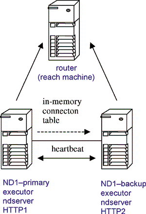 Eliminating the Network Dispatcher as a single point of failure by using two Network Dispatcher nodes (ND1-primary and ND1-backup) and the built-in high-availablility feature