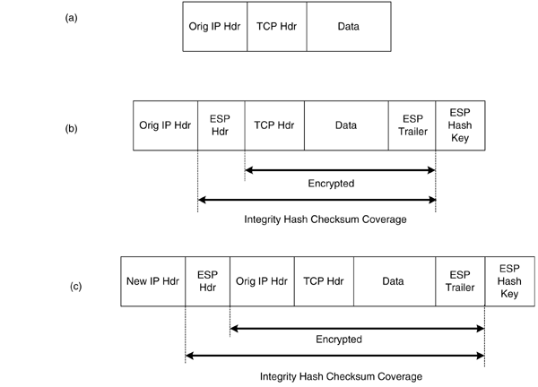 Encapsulating Security Payload (ESP) transformation, showing (a) original IP (IPv4) datagram, (b) transport mode encapsulation with checksum coverage, (c) tunnel mode with encapsulation of original datagram.