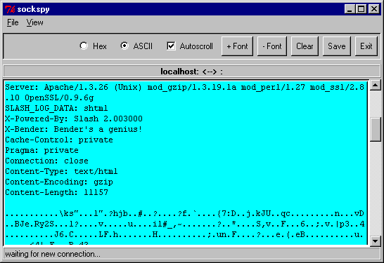 sockspy GUI displays segment of proxied HTTP dialogue