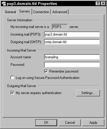 The account Properties dialog in Microsoft Outlook is used to configure the POP3 and SMTP servers and specify whether or not the outgoing server requires authentication.