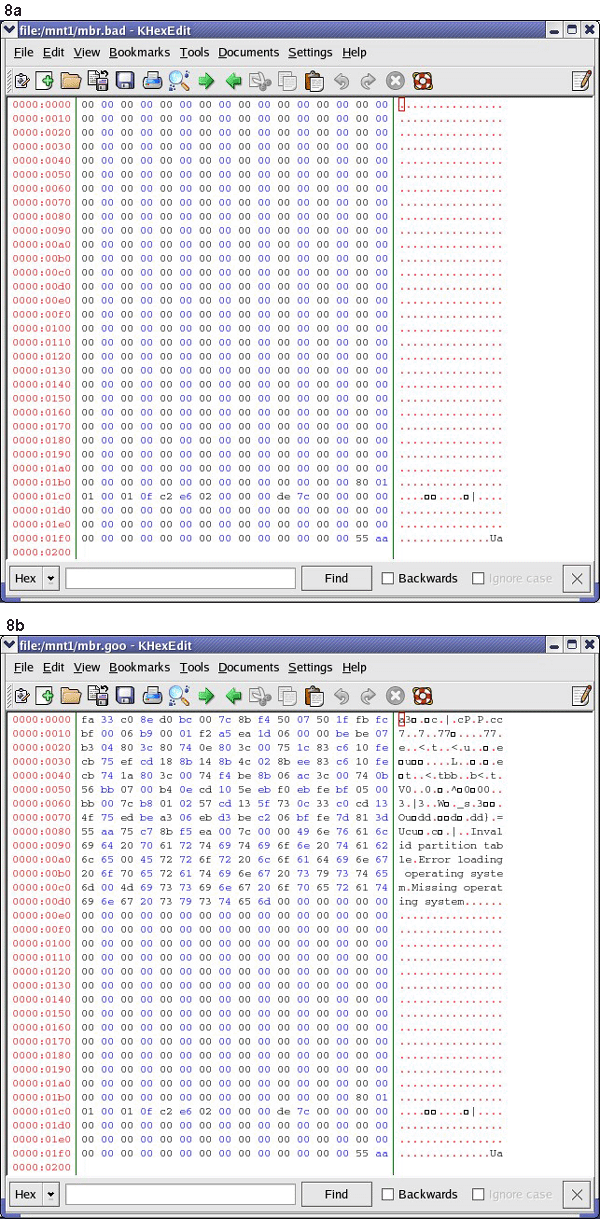 The left snapshot is MBR after the creation with fdisk. The right snapshot is an operational MBR with Step 1 bootstrap code
