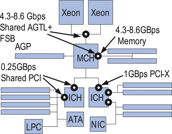 All components contend for the Northbridge (MCH) even in Xeon MP