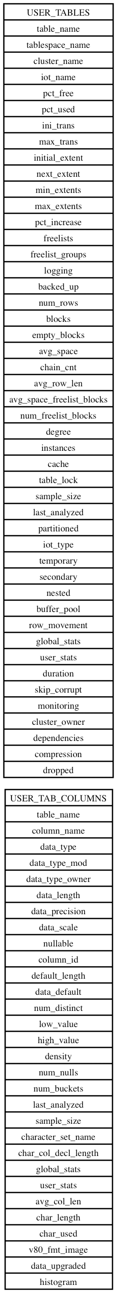 Graphical description of tables USER_TABLES and USER_TAB_COLUMNS