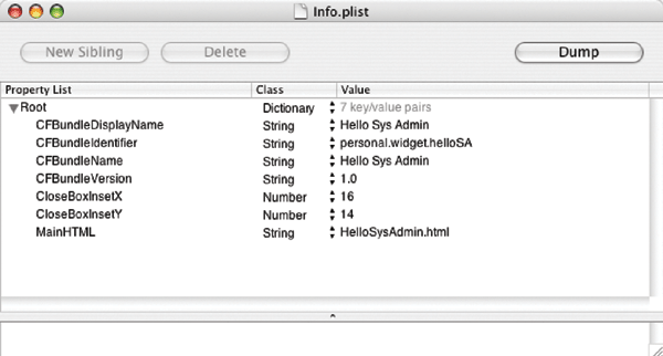 The contents of Info.plist for the "Hello Sys Admin magazine" widget as shown in Property List Editor